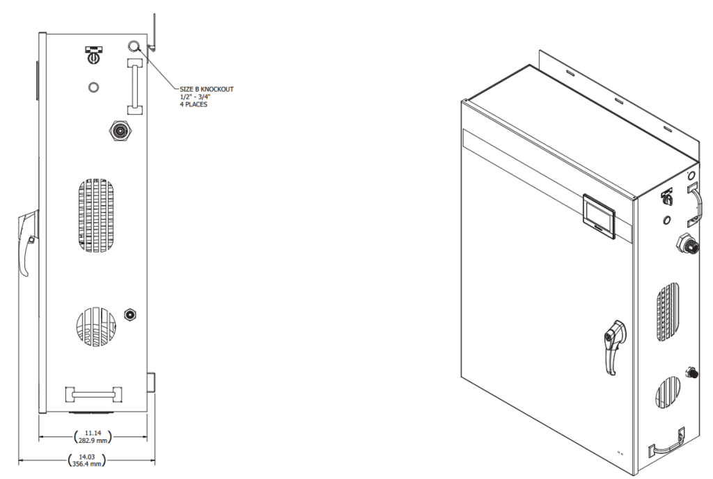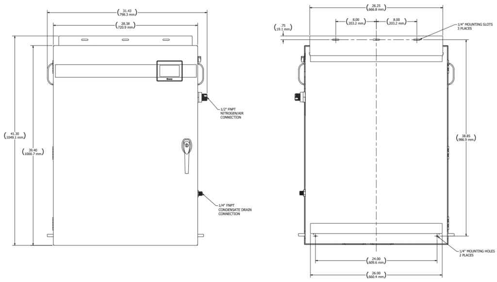 The ECS Nitrogen Generator is designed to be mounted directly to the wall at the installation location inside the riser room. Allow access to the front of the cabinet for service and place the unit in a location near fire sprinkler system connections, a drain, and a dedicated electrical connection. Allow for clearance around vents on side and bottom for proper cabinet ventilation. For detailed installation and operation please refer to the ECS AdvancedIQ Nitrogen Generator Manual.