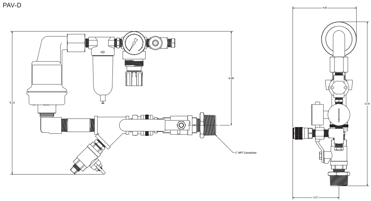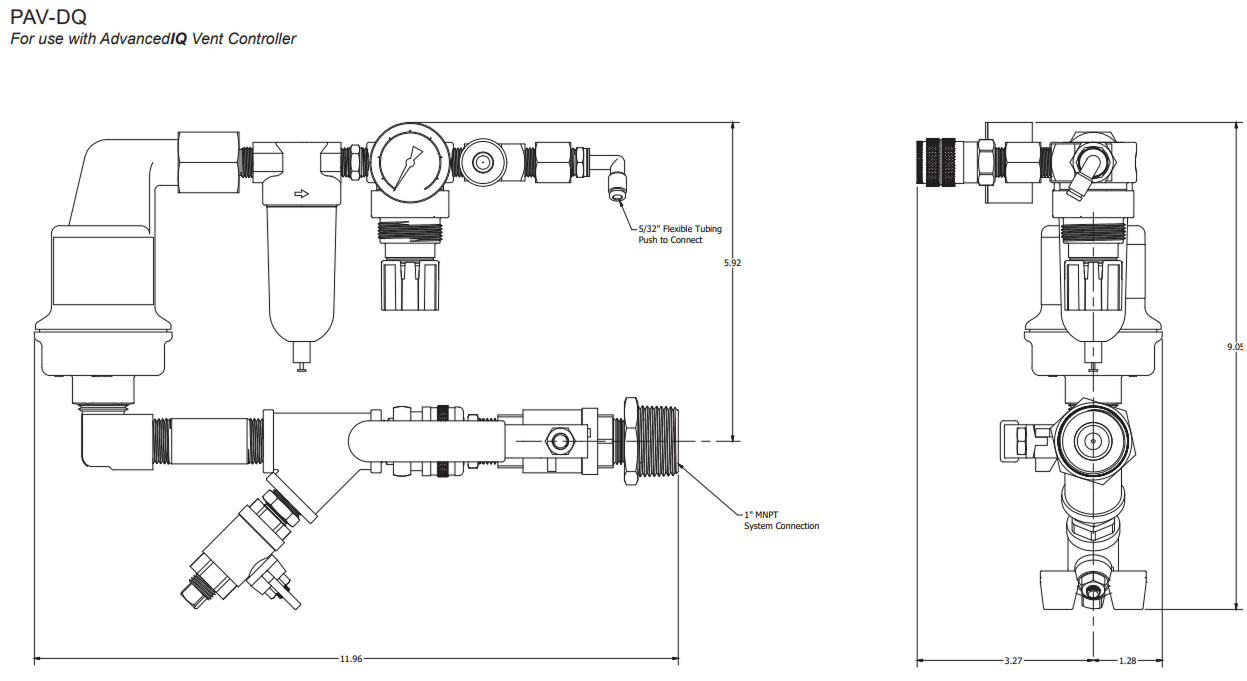 The ECS Protector Vent is to be installed as shown on the engineering design documents. If a location is not specified install the PAV-D/DQ vent on the fire sprinkler system riser on the system side of the main control valve. The PAV-D vent can be used to provide source gas for the ECS Protector SMART Gas Analyzer (SGA-1). The PAV-DQ includes the special 5/32” tubing fitting for use with the ECS AdvancedIQ Vent Controller. For detailed installation and operation please refer to the ECS AdvancedIQ Nitrogen Generator Manual or PAV-D/DQ installation sheet.
